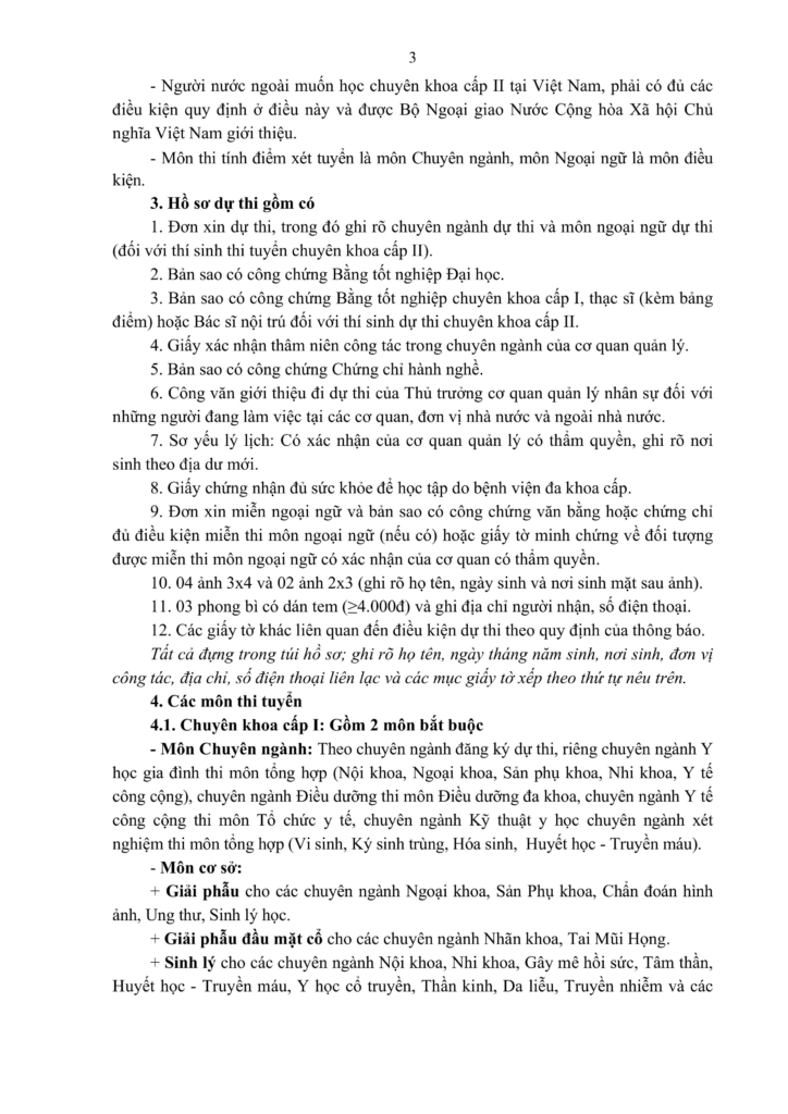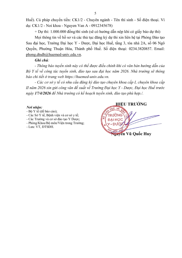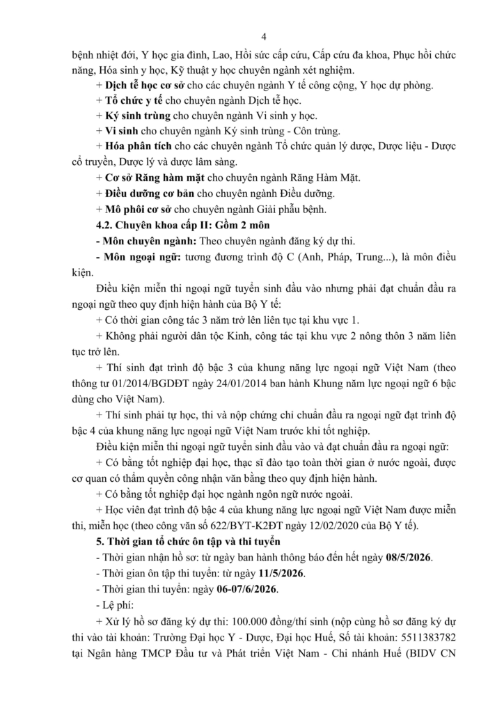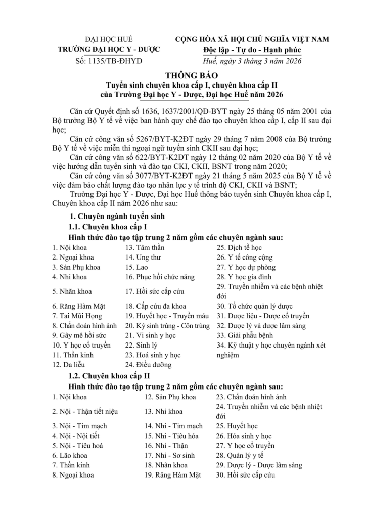 THÔNG BÁO Tuyển sinh chuyên khoa cấp I, chuyên khoa cấp II của Trường Đại học Y – Dược, Đại học Huế năm 2026