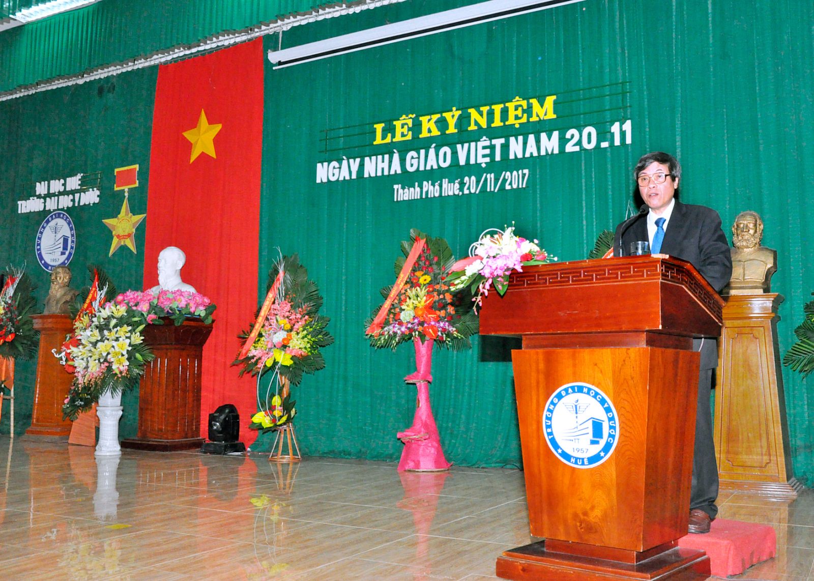 Khai mạc Lễ kỷ niệm, GS. Cao Ngọc Thành – Bí thư Đảng uỷ, Hiệu trưởng Trường đã đọc diễn văn ôn lại truyền thống ngày nhà giáo Việt Nam, đồng thời vinh danh và biểu dương các Nhà giáo, cán bộ viên chức, lao động Trường qua các thế hệ. Tự hào với 60 năm sự nghiệp trồng người, Nhà trường đã không ngừng phát triển về nhiều mặt, là một trong những trường Đại học có đóng góp to lớn trong sự nghiệp đào tạo nhân lực y tế, chăm sóc và bảo vệ sức khỏe của nhân dân, thầy Hiệu trưởng nhấn mạnh nhiệm vụ trọng tâm của Nhà trường trong thời kỳ tiếp theo đó là nâng cao chất lượng đào tạo đại học và sau đại học đáp ứng nhu cầu chăm sóc sức khỏe của xã hội và sự phát triển của ngành, địa phương, khu vực; Tăng cường quản lý KHCN, nâng cao hiệu quả ứng dụng và chuyển giao công nghệ và công bố quốc tế; Tăng cường hội nhập quốc tế, liên kết với các trường đại học nước ngoài để xây dựng các chương trình đào tạo mũi nhọn, tiên tiến, chất lượng cao; Đổi mới cơ chế tài chính và xây dựng lộ trình tự chủ đại học, lập kế hoạch chuẩn bị các điều kiện theo quy định để thực hiện tự chủ đại học trong năm 2018. Phấn đấu trở thành trường đại học trọng điểm quốc gia về đào tạo nguồn nhân lực y tế, là Trường đại học khoa học sức khỏe.