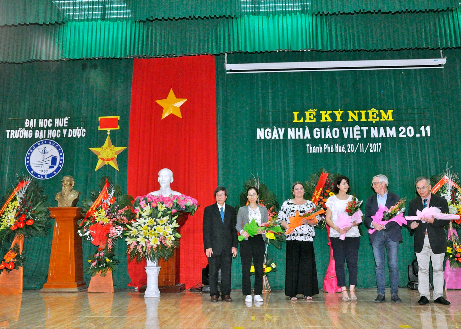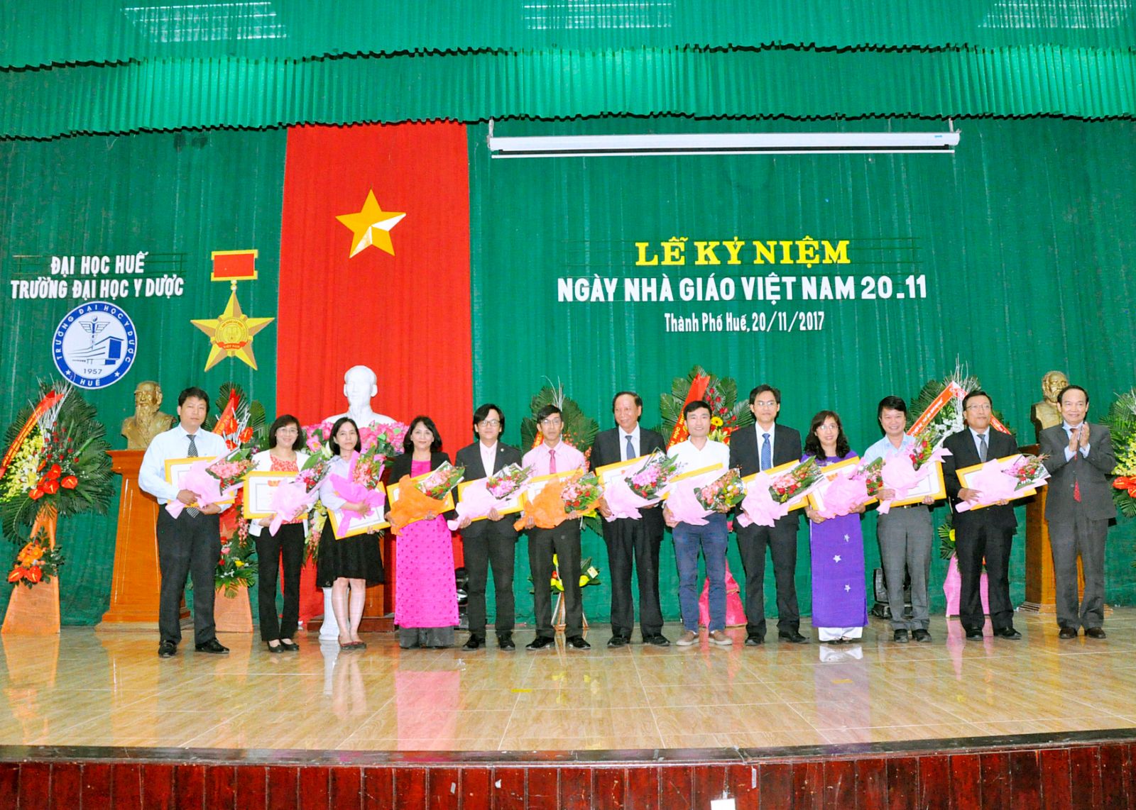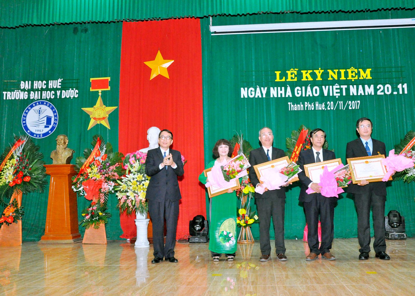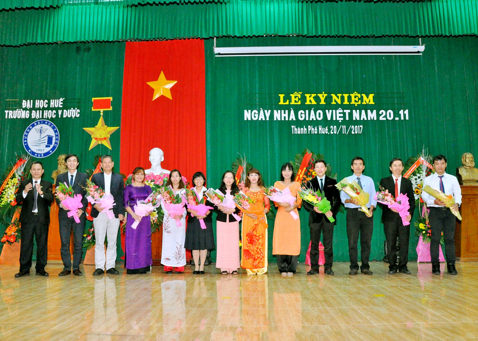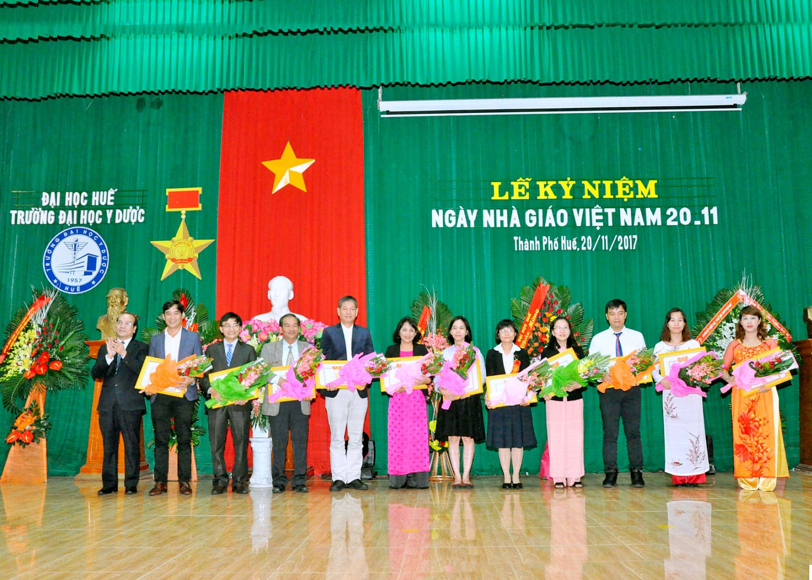 Nhân dịp này, Trường cũng đã công bố và trao danh hiệu Nhà giáo ưu tú năm 2017 do Chủ tịch nước phong tặng cho 04 giảng viên của Trường. Bên cạnh đó, Trường cũng đã chúc mừng và tặng hoa cho 12 Giảng viên của Nhà trường đã bảo vệ thành công Luận án Tiến sĩ Y học ở trong và ngoài nước; 24 cán bộ được các giải thưởng cao trong nghiên cứu khoa học, lao động sáng tạo, Khuyến khích tài năng Đại học Huế, Nhân tài Đất Việt, có bài báo khoa học được đăng lại trên tạp chí nước ngoài. Đồng thời cũng tặng hoa chúc mừng các giáo sư và chuyên gia nước ngoài đang làm việc tại Trường.