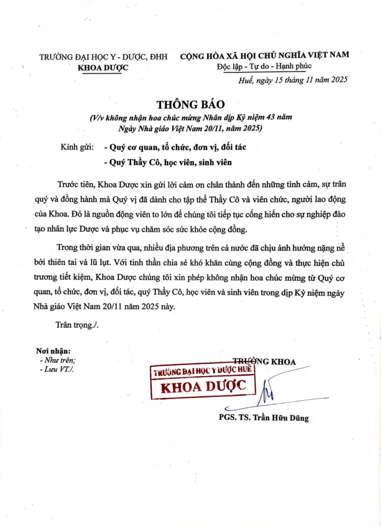 Khoa Dược, Trường Đại học Y – Dược, Đại học Huế xin trân trọng thông báo đến Quý cơ quan, tổ chức, đơn vị, đối tác, quý Thầy Cô, học viên, sinh viên về việc không nhận hoa chúc mừng Nhân dịp Kỷ niệm 43 năm Ngày Nhà giáo Việt Nam 20/11 năm 2025.