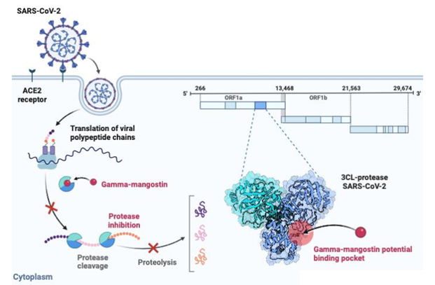– Cơ chế hoạt động chính của gamma-mangostin xuất hiện sớm ở giai đoạn cản trở sự xâm nhập của virus vào tế bào vật chủ, bằng cách liên kết với protein bề mặt của virus, từ đó có thể ức chế sự gắn kết và sự hợp nhất tiếp theo của virus với tế bào vật chủ. Điều này có hiệu quả làm giảm số lượng virus có khả năng xâm nhập vào tế bào vật chủ, do đó hạn chế sự lây lan của virus.